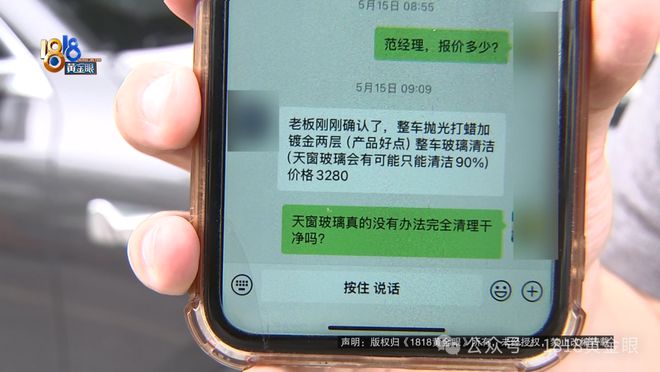 王先生:包括抛光打蜡,再一个镀晶。做外墙的这个老板他说不能镀晶,我说我这个新车,车子的漆,一生中抛多少次是有数的,我这4个月新车你给我抛一次,是不是要给我加一层保护,去掉一层保护,加一层保护。我又没讹他,我也吃点亏,我再补几百,让他们给到3000元。2500元是上午说的,到下午又变成2200元,昨天晚上又成1100元了。