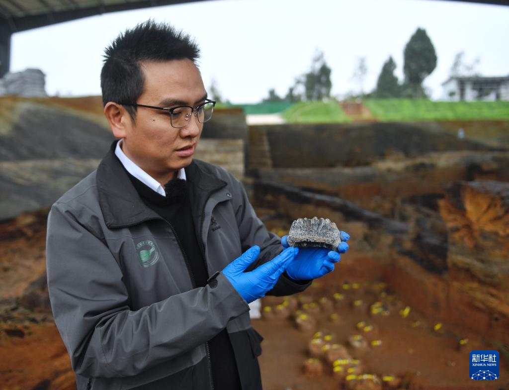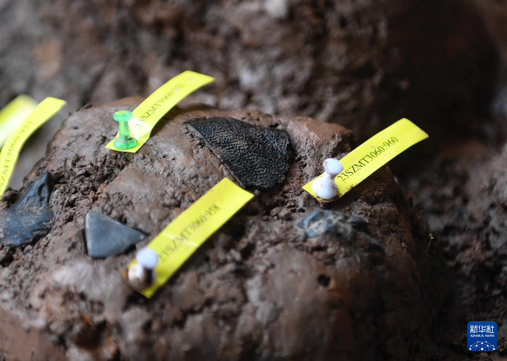 这是在四川资阳濛溪河遗址群内发掘的龟甲(2023年12月5日摄)。新华社记者 刘坤 摄
